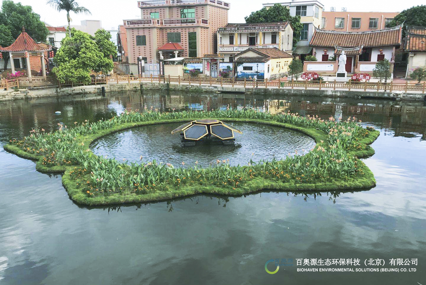 漳州角美鎮(zhèn)埔尾村祠堂大塘為白石林先生祠、進士牌及傳統(tǒng)民居等古建筑環(huán)繞,是埔尾村重要的水景觀節(jié)點,更是漳州臺商投資區(qū)廉政教育基地及埔尾村鄉(xiāng)賢鄉(xiāng)訓(xùn)館的主要配套景點。埔尾村扎實推進鄉(xiāng)村振興戰(zhàn)略,在實施農(nóng)村污水收集處理工程的基礎(chǔ)上,結(jié)合截污納管、補水措施等工程,創(chuàng)新采用的浮動凈水廠技術(shù),以生態(tài)手段同步實現(xiàn)水質(zhì)改善與景觀提升,打造大塘優(yōu)美水環(huán)境的目標(biāo),并與埔尾村古建筑景觀互映互襯,彰顯千年古村落的獨有生態(tài)之美。