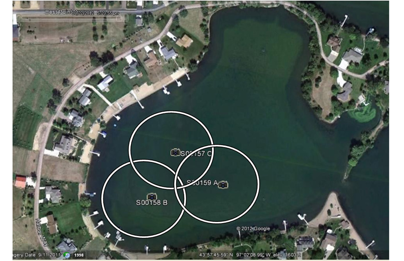位于美國南達(dá)科他州Harbor Bay的Madison湖長(zhǎng)期接收周圍農(nóng)業(yè)面源污染、地表徑流和市政污水的污染物入湖,湖底堆積的底泥常年向水中釋放污染物,導(dǎo)致湖體水質(zhì)富營(yíng)養(yǎng)化嚴(yán)重 。2012年6月初由于干旱湖水水面下降,藍(lán)藻大規(guī)模爆發(fā)。根據(jù)該項(xiàng)目現(xiàn)場(chǎng)踏勘及底泥調(diào)查結(jié)果,設(shè)計(jì)將三臺(tái)奧科?太陽能循環(huán)復(fù)氧設(shè)備以三角形點(diǎn)位布設(shè)。