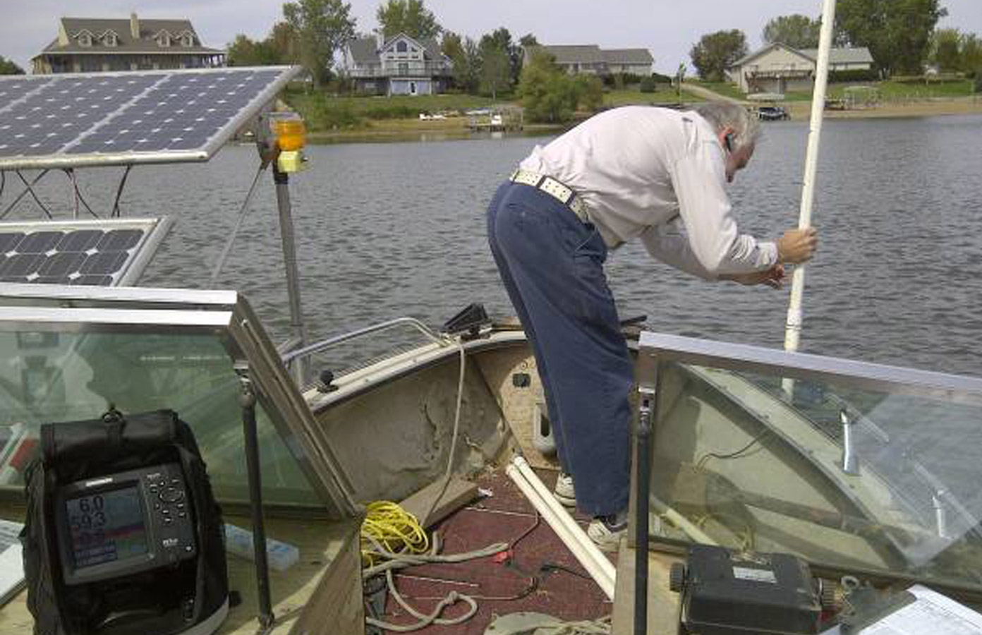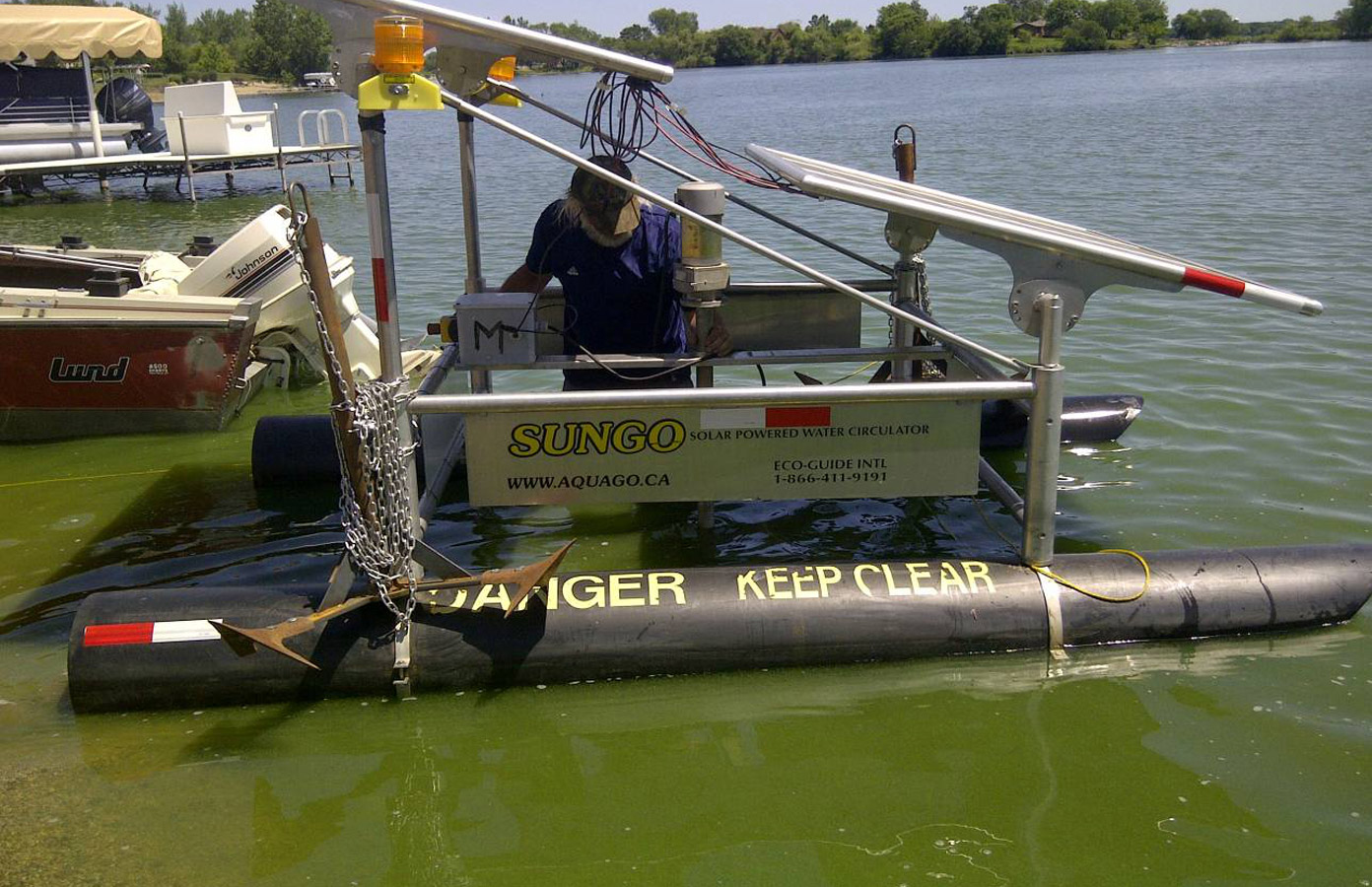 位于美國南達(dá)科他州Harbor Bay的Madison湖長(zhǎng)期接收周圍農(nóng)業(yè)面源污染、地表徑流和市政污水的污染物入湖,湖底堆積的底泥常年向水中釋放污染物,導(dǎo)致湖體水質(zhì)富營(yíng)養(yǎng)化嚴(yán)重 。2012年6月初由于干旱湖水水面下降,藍(lán)藻大規(guī)模爆發(fā)。根據(jù)該項(xiàng)目現(xiàn)場(chǎng)踏勘及底泥調(diào)查結(jié)果,設(shè)計(jì)將三臺(tái)奧科?太陽能循環(huán)復(fù)氧設(shè)備以三角形點(diǎn)位布設(shè)。